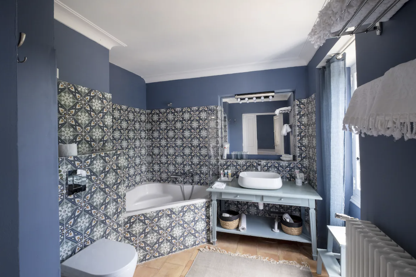 Elle dispose d'une salle de bain avec une grande baignoire. Un carrelage mat type ancien carreaux de ciment provençal vient en habiller les murs.